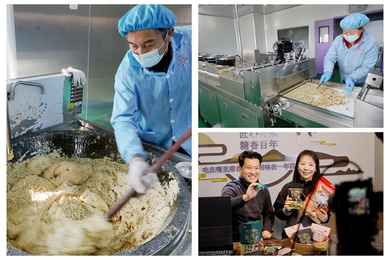 右下图:镇村干部在直播间里向全网推荐徐集花生糖。