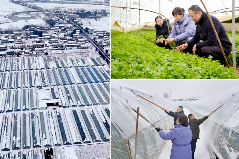 左图:1月20日,在农技人员的指导下,裕安区顺河镇安城村300多个蔬菜大棚积雪被及时清理。