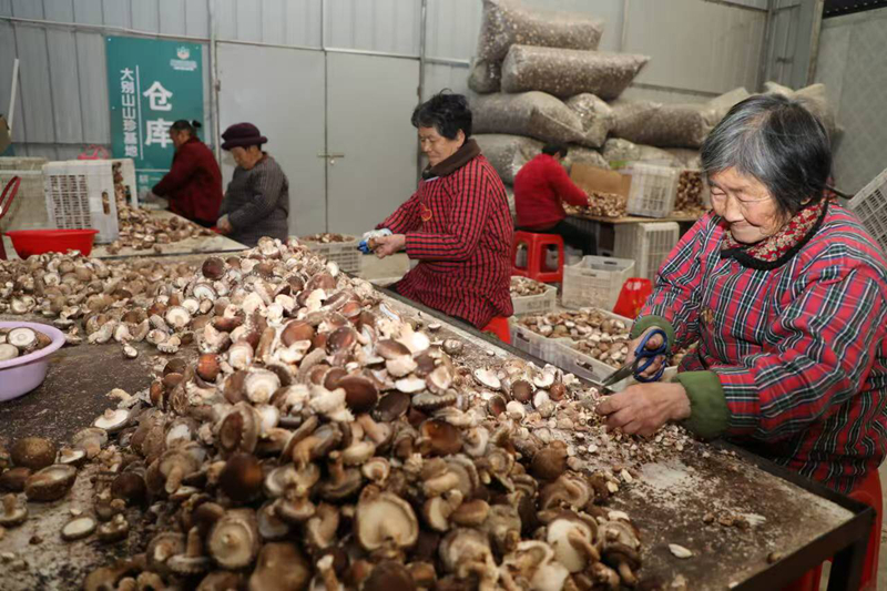 近日,位于金寨县汤家汇镇竹畈村的香菇基地里,工人们正忙着分拣香菇,现场一派繁忙景象。