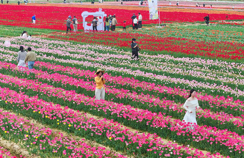 4月6日,游人在金安区淠东乡郁金香花海游览、拍照打卡,尽享乡村游玩乐趣。