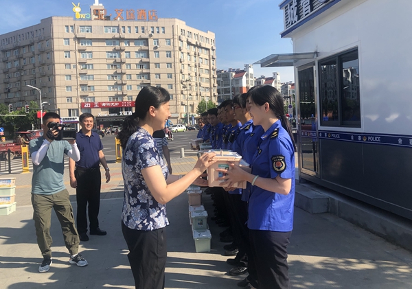 8月4日,金寨县委常委、组织部部长、县总工会主席赵锦文带着毛巾、洗发水、花露水、防晒伞等消暑物品,来到安徽华锦工程有限公司项目部、金寨县城市管理行政执法局二大队红军大道执勤点,为战高温、斗酷暑的工人和城管执勤人员送去了夏日的清凉问候。