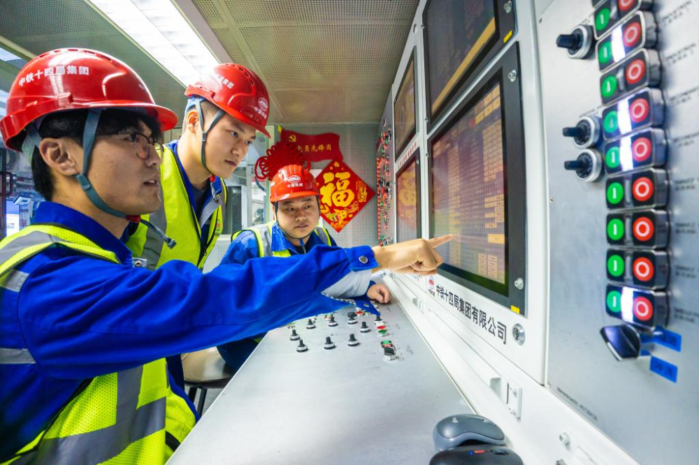 图为盾构机驾驶员在驾驶舱分析盾构机掘进参数。(中铁十四局供图)